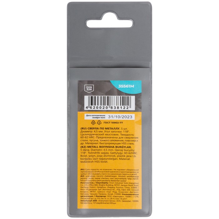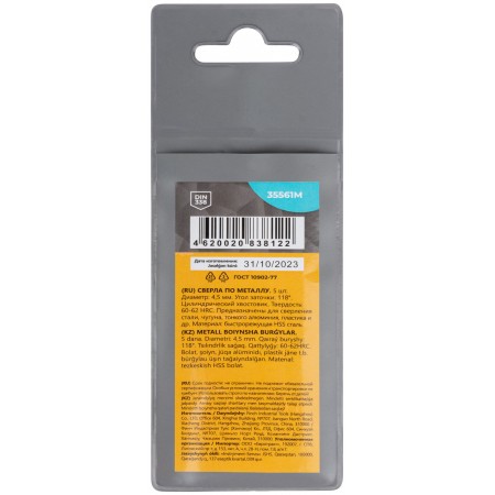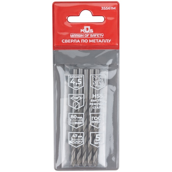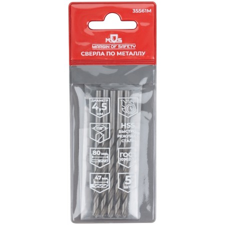 Сверла по металлу HSS, угол заточки 118°, 4,5 x 80 мм, (5 шт.) (35561М)