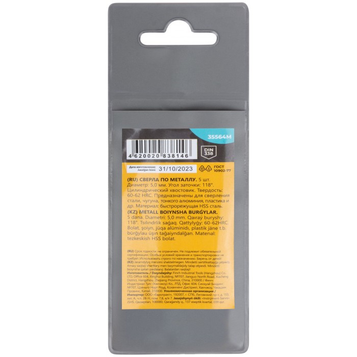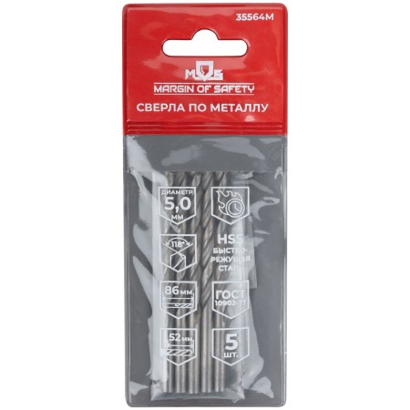 Сверла по металлу HSS, угол заточки 118°, 5,0 x 86 мм, (5 шт.) (35564М)