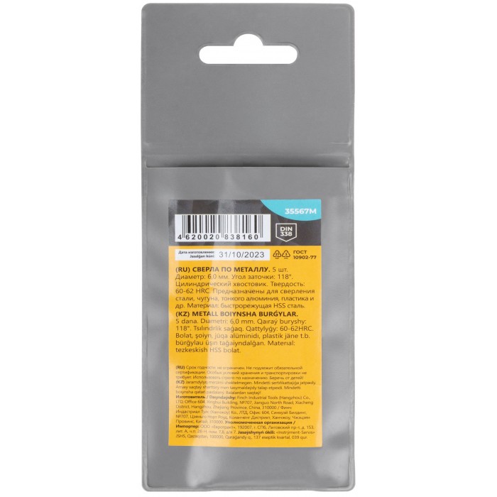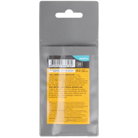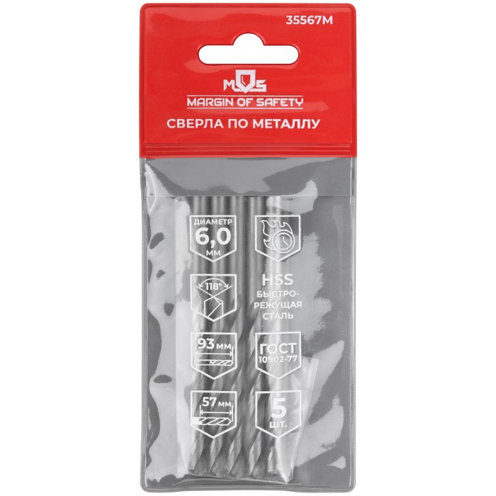 Сверла по металлу HSS, угол заточки 118°, 6,0 x 93 мм, (5 шт.) (35567М)
