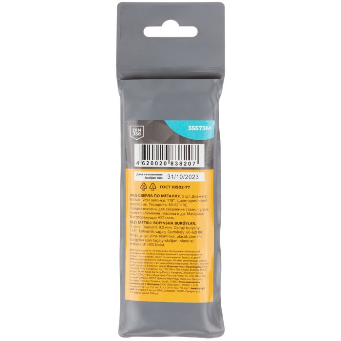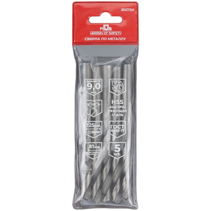 Сверла по металлу HSS, угол заточки 118°, 9,0 x 125 мм, (5 шт.) (35573М)