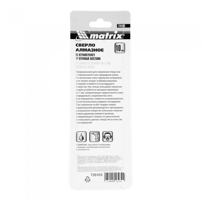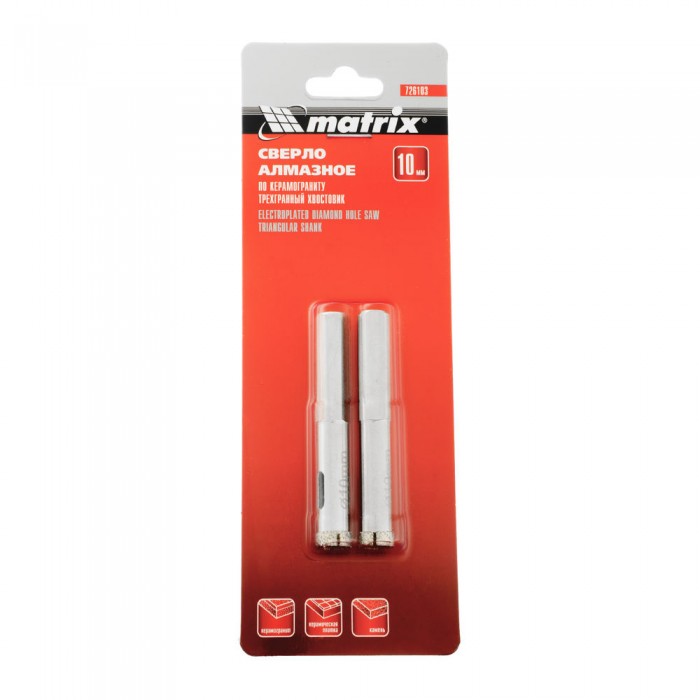 Сверло алмазное по керамограниту, 10 х 67 мм, трехгранный хвостовик, 2 шт Matrix (726103)
