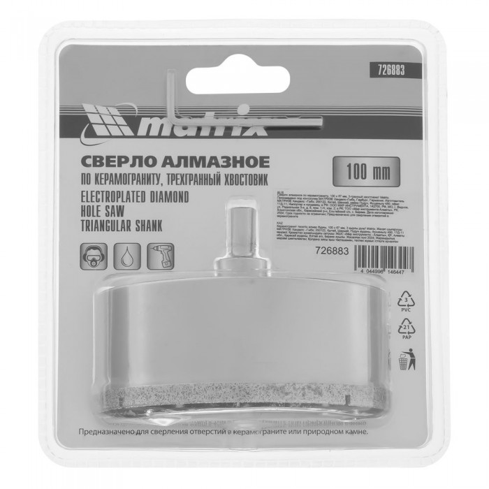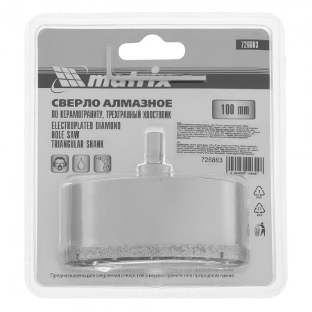 Сверло алмазное по керамограниту, 100 х 67 мм, трехгранный хвостовик Matrix (726883)