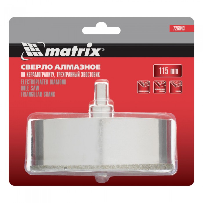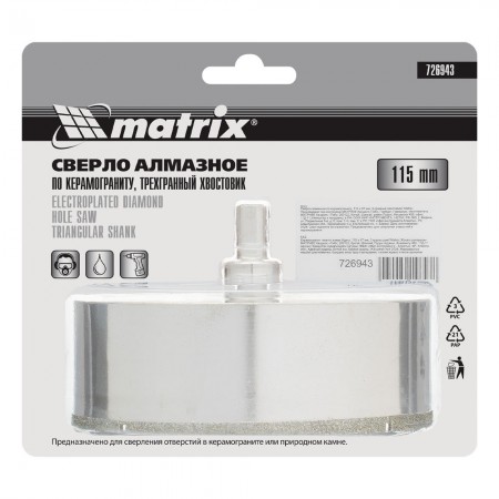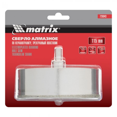 Сверло алмазное по керамограниту, 115 х 67 мм, трехгранный хвостовик Matrix (726943)