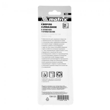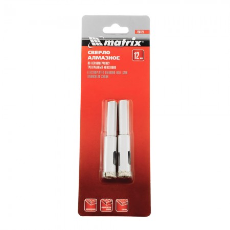 Сверло алмазное по керамограниту, 12 х 67 мм, трехгранный хвостовик, 2 шт Matrix (726123)