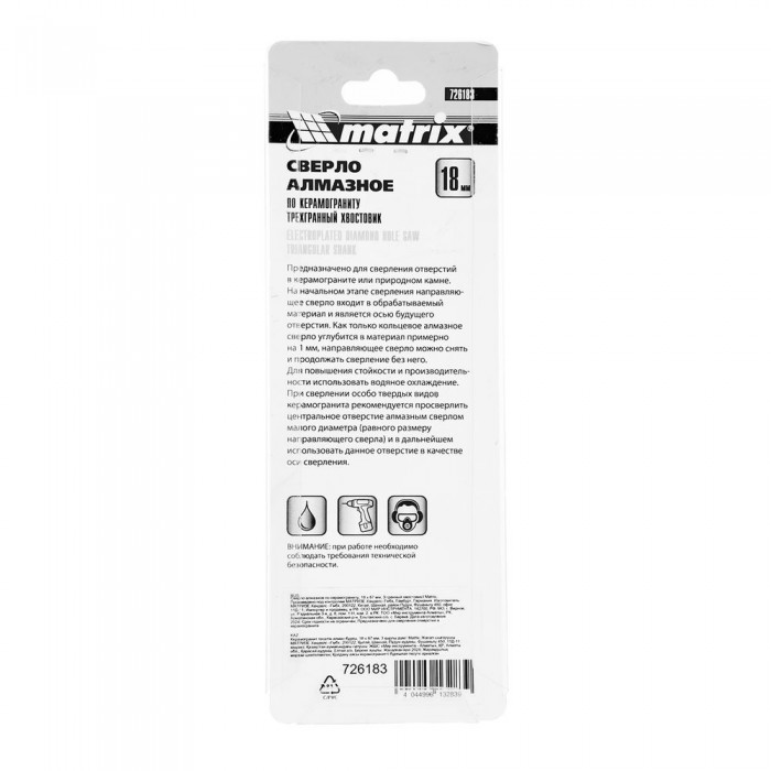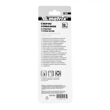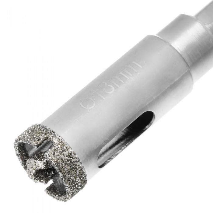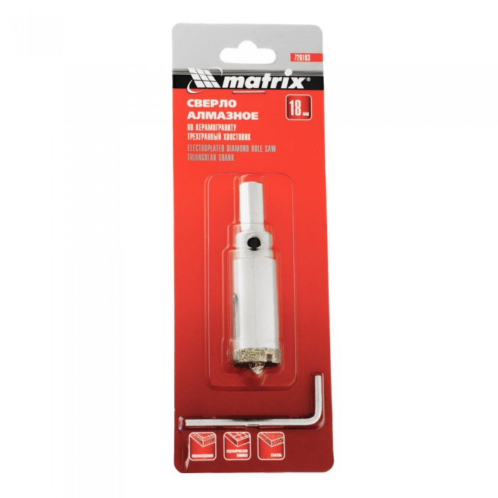 Сверло алмазное по керамограниту, 18 х 67 мм, трехгранный хвостовик Matrix (726183)