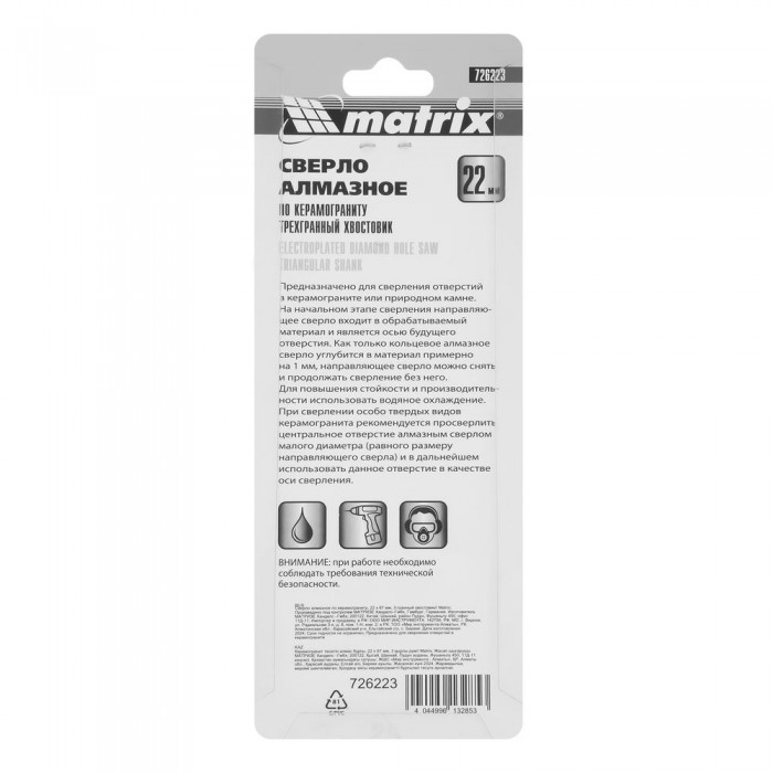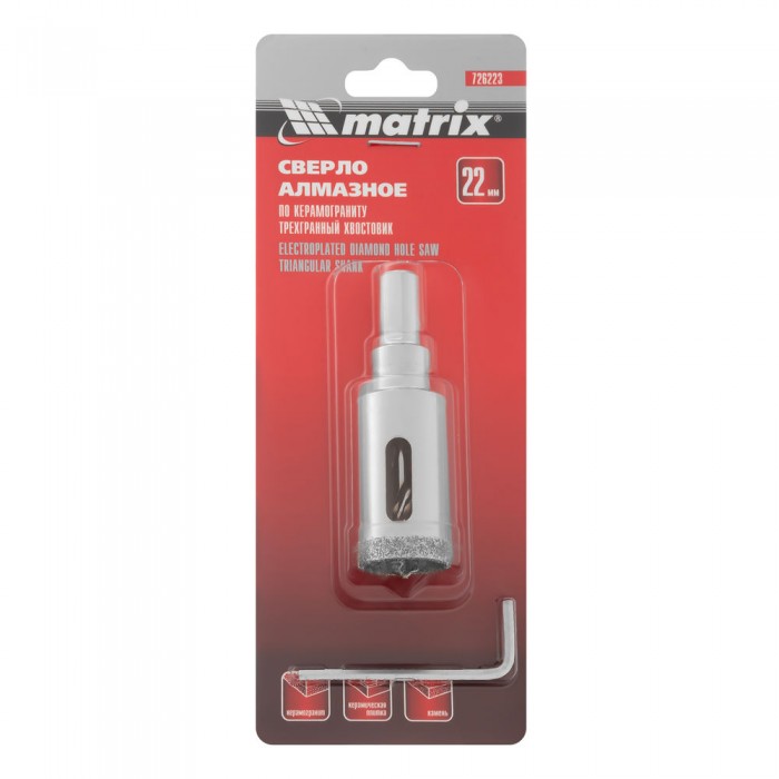 Сверло алмазное по керамограниту, 22 х 67 мм, трехгранный хвостовик Matrix (726223)