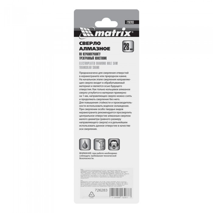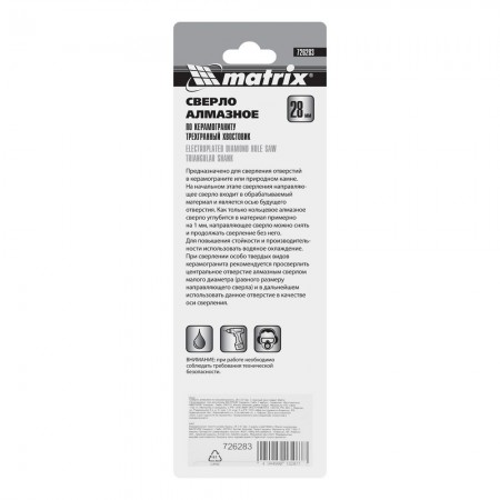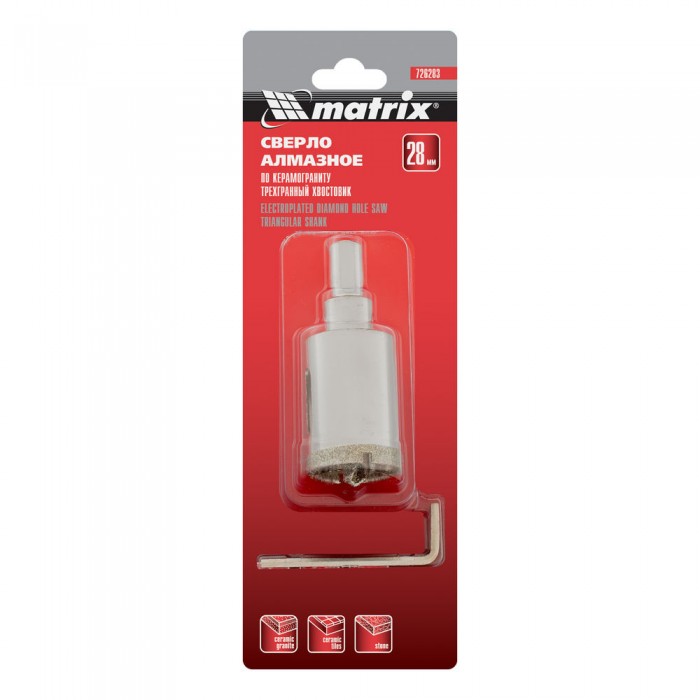 Сверло алмазное по керамограниту, 28 х 67 мм, трехгранный хвостовик Matrix (726283)