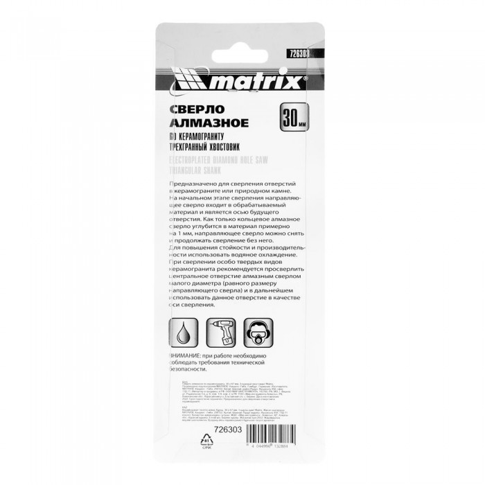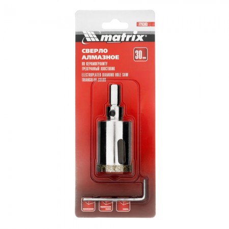 Сверло алмазное по керамограниту, 30 х 67 мм, трехгранный хвостовик Matrix (726303)
