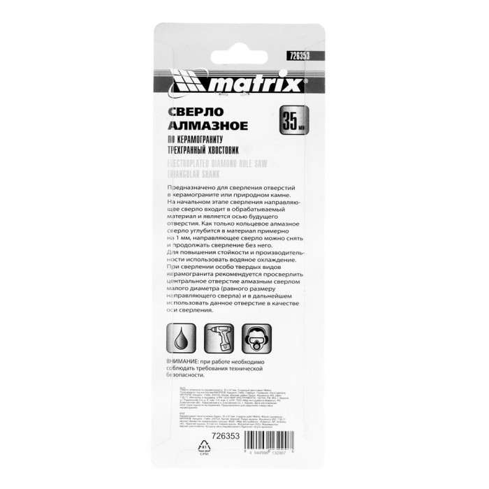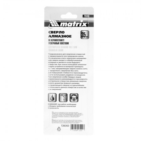 Сверло алмазное по керамограниту, 35 х 67 мм, трехгранный хвостовик Matrix (726353)