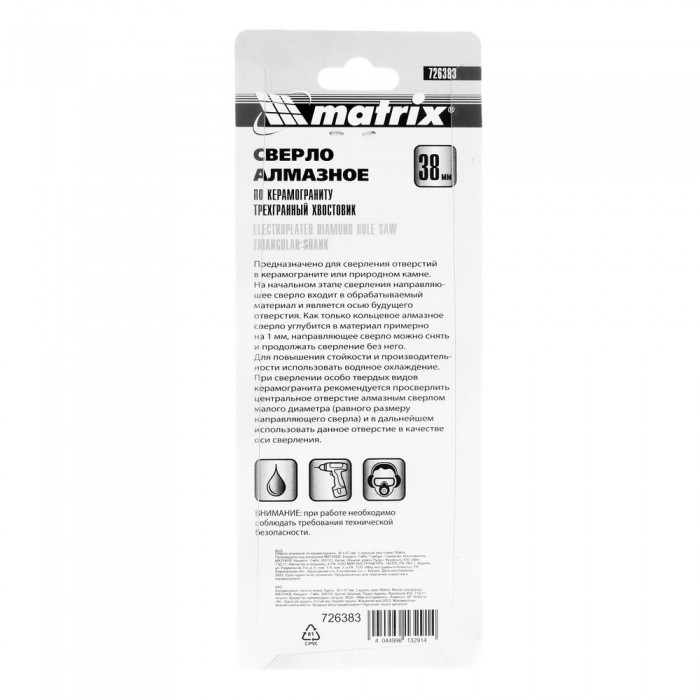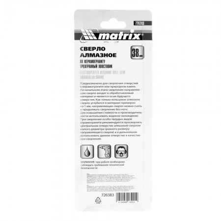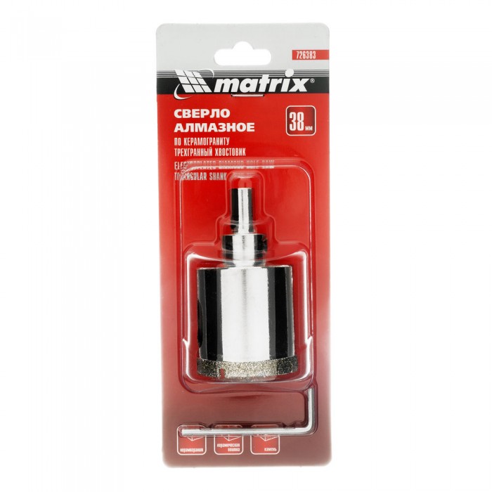 Сверло алмазное по керамограниту, 38 х 67 мм, трехгранный хвостовик Matrix (726383)