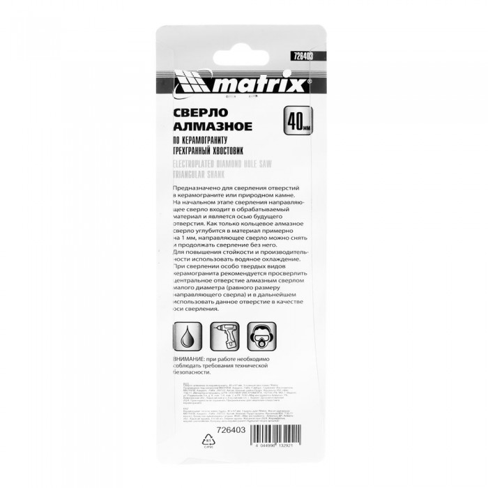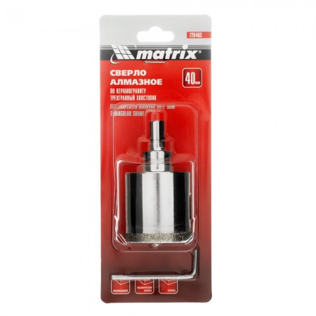 Сверло алмазное по керамограниту, 40 х 67 мм, трехгранный хвостовик Matrix (726403)