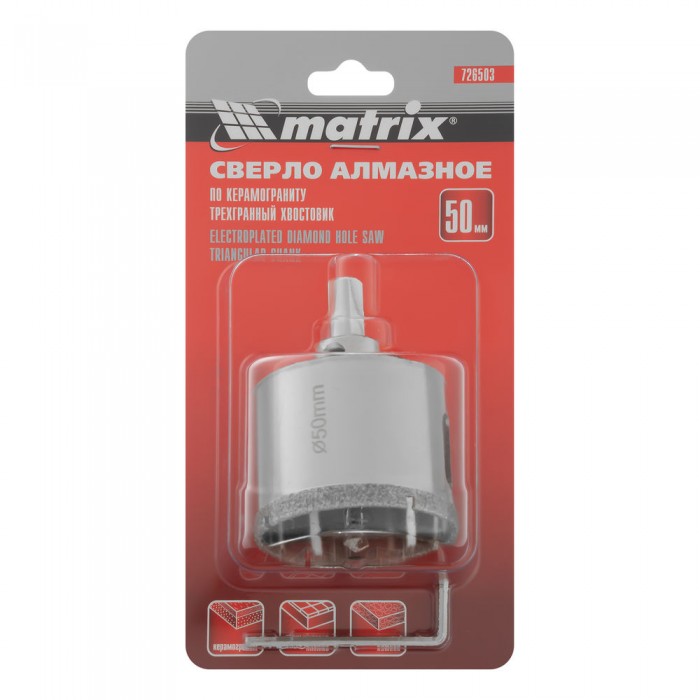 Сверло алмазное по керамограниту, 50 х 67 мм, трехгранный хвостовик Matrix (726503)