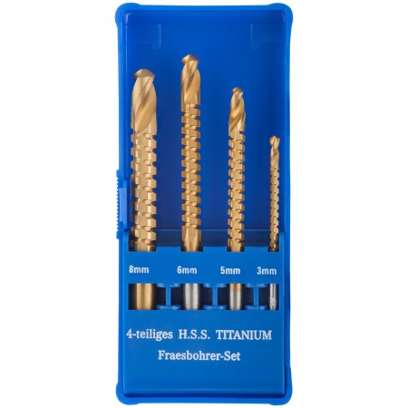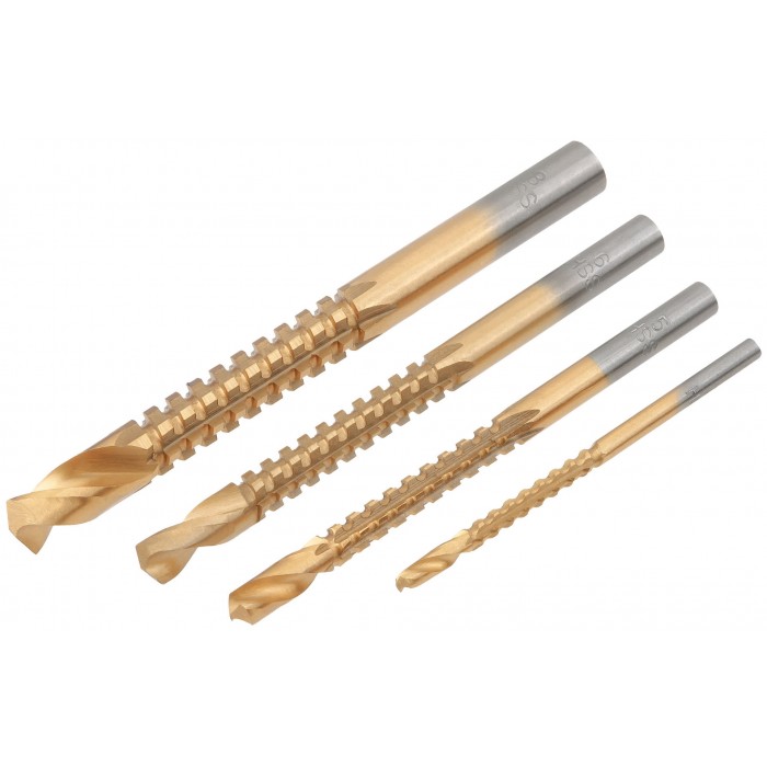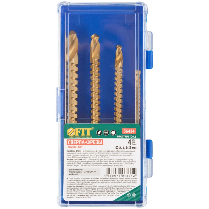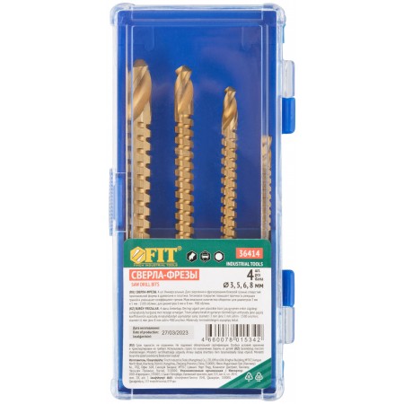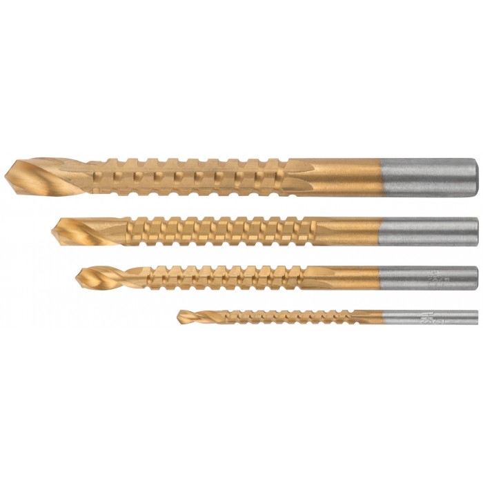 Универсальное. Для высверливания и выпиливания боковой гранью отверстий произвольной формы в дереве и пластмассе толщиной до 3 мм. Цилиндрический хвостовик. Титановое износостойкое покрытие. Упаковка: 36406,36408 – в блистере, 36414 – пластиковая коробка. (Набор - 4 шт.:3; 5; 6; 8 мм).
