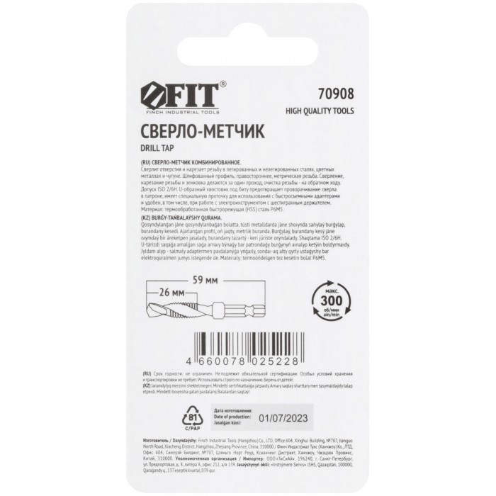 Для сверления отверстий и нарезания резьбы в легированных и нелигированных сталях, цветных металлах и чугуне. Шлифованный профиль, правостороннее, метрическая резьба. Шестигранный U-образный хвостик. Материал: быстрорежущая (HSS) сталь P6M5. Упаковка : блистер.