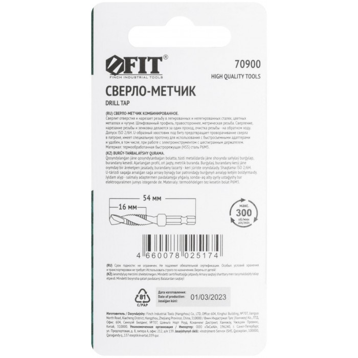 Для сверления отверстий и нарезания резьбы в легированных и нелигированных сталях, цветных металлах и чугуне. Шлифованный профиль, правостороннее, метрическая резьба. Шестигранный U-образный хвостик. Материал: быстрорежущая (HSS) сталь P6M5. Упаковка : блистер.