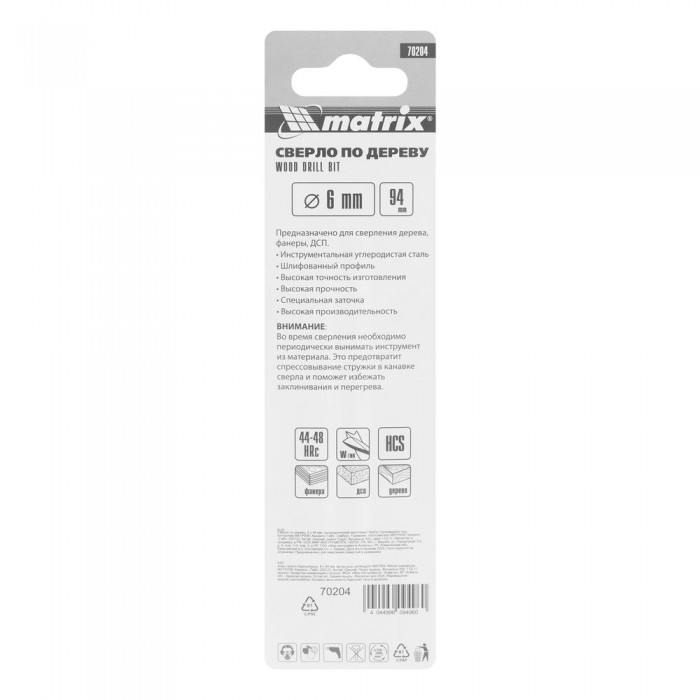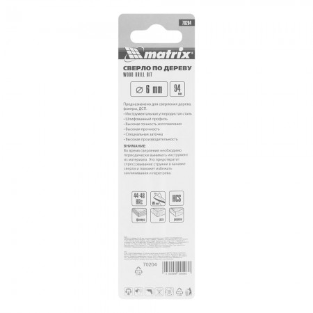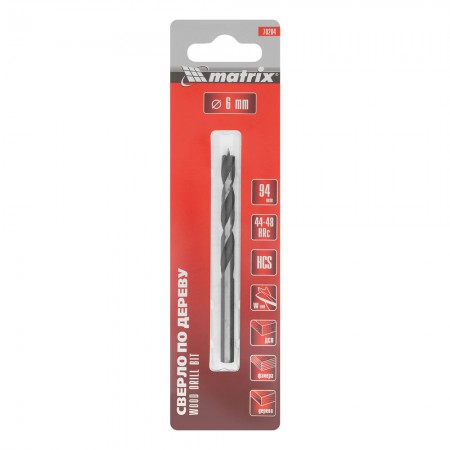 Сверло по дереву, 6 x 94 мм, цилиндрический хвостовик Matrix (70204)
