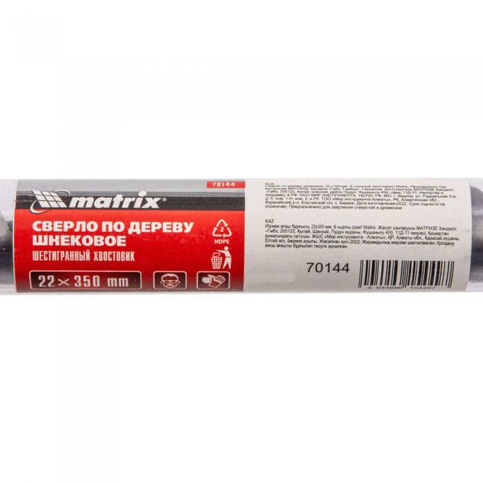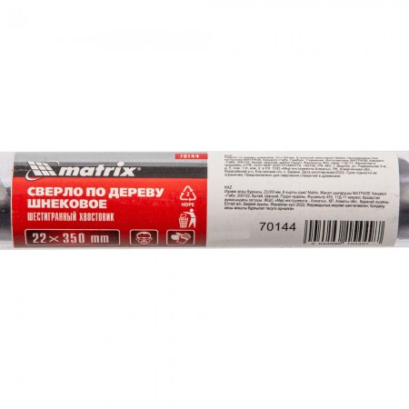 Сверло по дереву шнековое, 22 х 350 мм, шестигранный хвостовик Matrix
