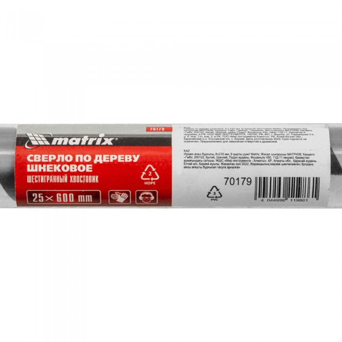 Сверло по дереву шнековое, 25 х 600 мм, шестигранный хвостовик Matrix