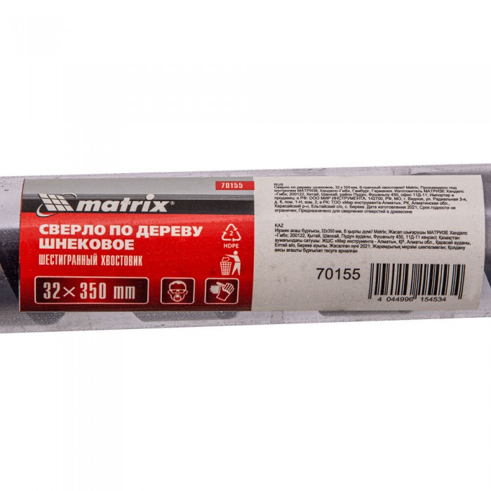 Сверло по дереву шнековое, 32 х 350 мм, шестигранный хвостовик Matrix