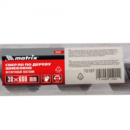 Сверло по дереву шнековое, 38 х 600 мм, шестигранный хвостовик Matrix