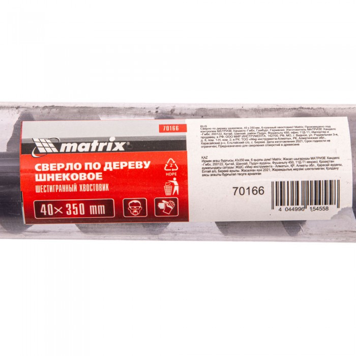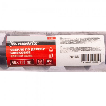 Сверло по дереву шнековое, 40 х 350 мм, шестигранный хвостовик Matrix