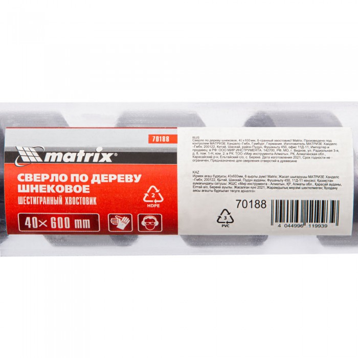 Сверло по дереву шнековое, 40 х 600 мм, шестигранный хвостовик Matrix