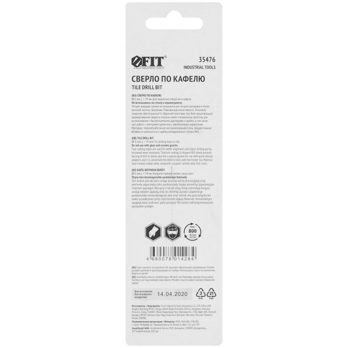 U-образный хвостовик под биту. Четыре режущие кромки. Для сверления отверстий в кафельной плитке. Повышенная производительность. Материал: инструментальная сталь с титановым покрытием, твердосплавные вставки. Упаковка: блистер.
