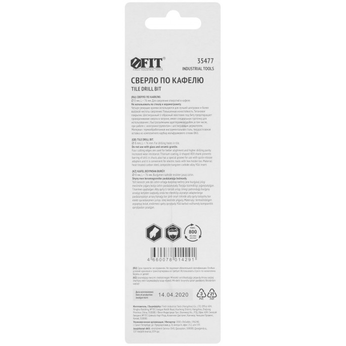 U-образный хвостовик под биту. Четыре режущие кромки. Для сверления отверстий в кафельной плитке. Повышенная производительность. Материал: инструментальная сталь с титановым покрытием, твердосплавные вставки. Упаковка: блистер.