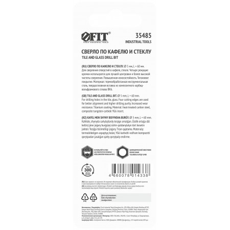 Четыре режущие кромки. Для сверления отверстий в стекле, кафельной плитке. Повышенная производительность. Материал: инструментальная сталь с титановым покрытием, твердосплавные вставки. Упаковка: блистер.