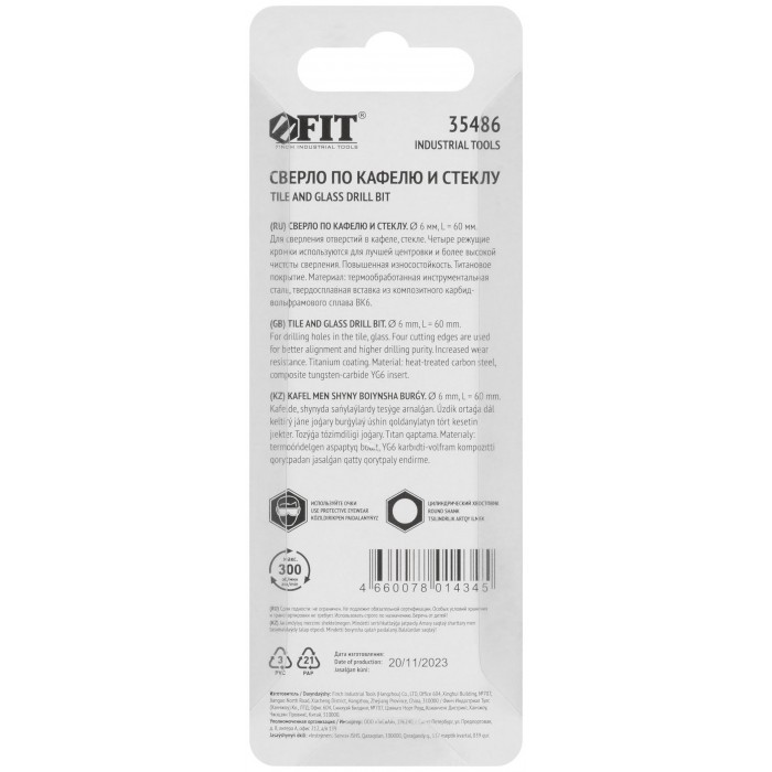 Четыре режущие кромки. Для сверления отверстий в стекле, кафельной плитке. Повышенная производительность. Материал: инструментальная сталь с титановым покрытием, твердосплавные вставки. Упаковка: блистер.