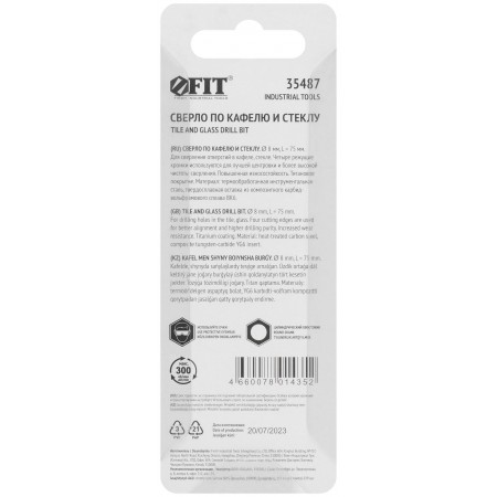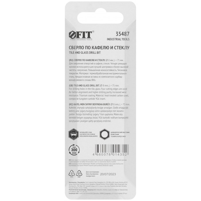Четыре режущие кромки. Для сверления отверстий в стекле, кафельной плитке. Повышенная производительность. Материал: инструментальная сталь с титановым покрытием, твердосплавные вставки. Упаковка: блистер.