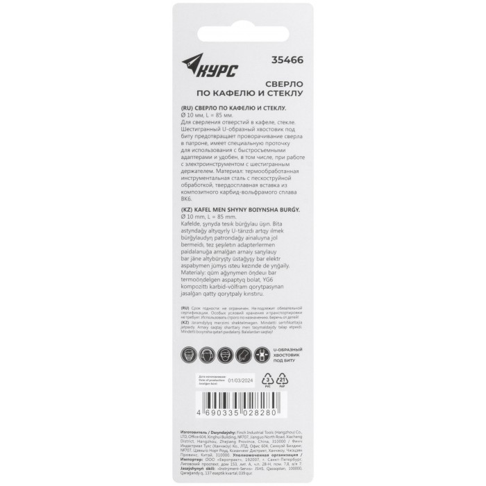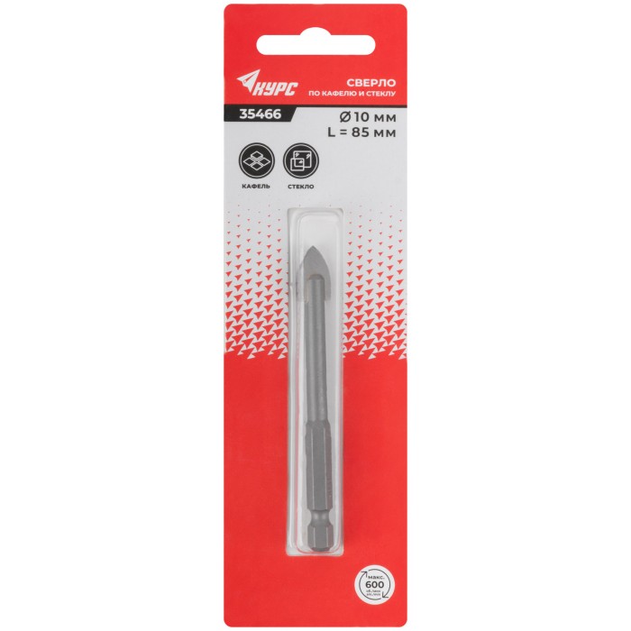 Сверло по кафелю и стеклу, шестигранный U-хвостовик под биту 10х85 мм (35466)
