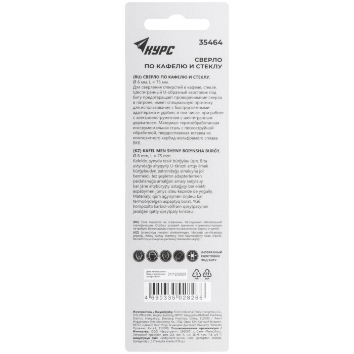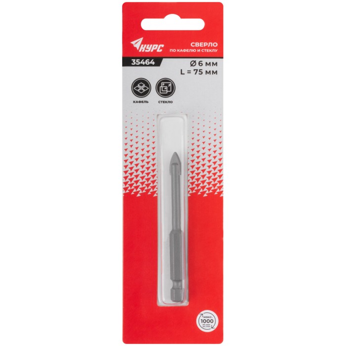 Сверло по кафелю и стеклу, шестигранный U-хвостовик под биту 6х75 мм (35464)