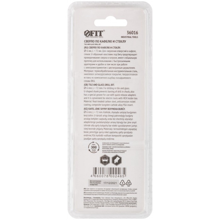 Сверло по кафелю, шестигранный U-хвостовик под биту 6 мм (36016)