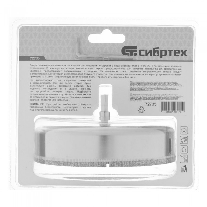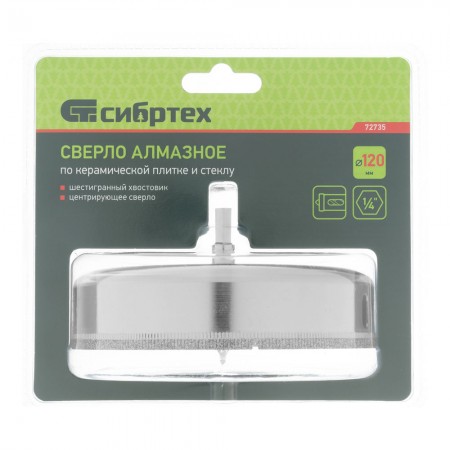 Сверло по керамической плитке и стеклу, 120 х 55 мм, шестигранный хвостовик, с центрующим сверлом Сибртех (72735)
