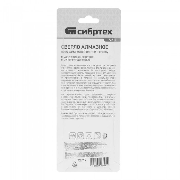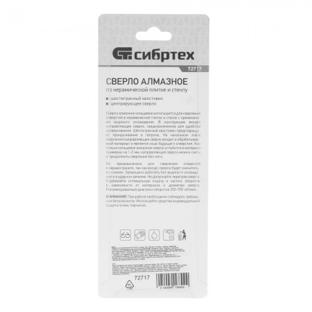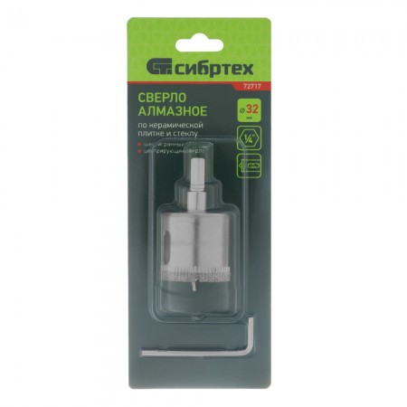 Сверло по керамической плитке и стеклу, 32 х 55 мм, шестигранный хвостовик, с центрующим сверлом Сибртех (72717)