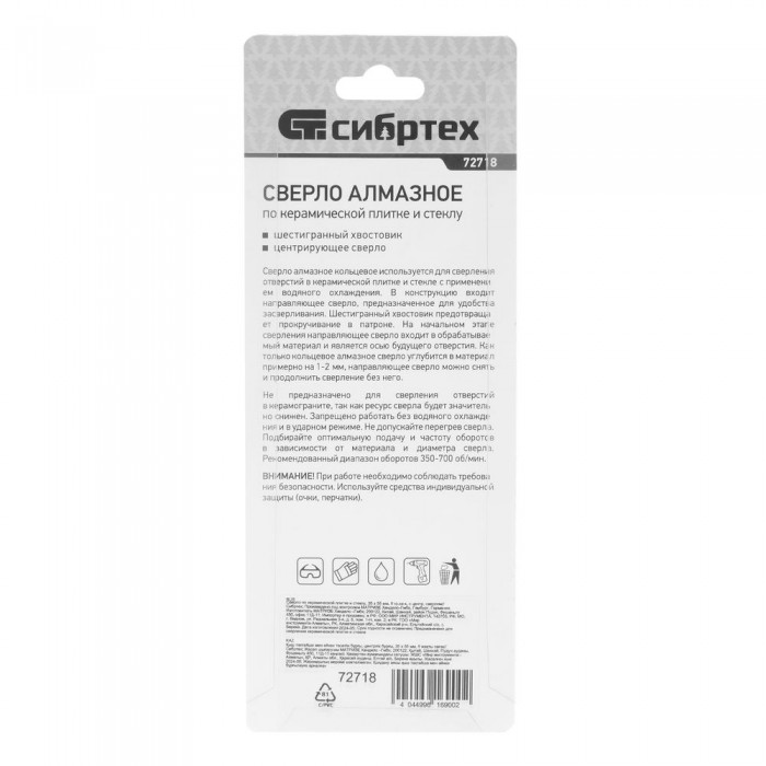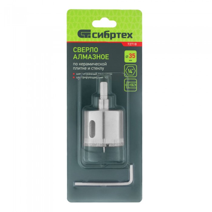Сверло по керамической плитке и стеклу, 35 х 55 мм, шестигранный хвостовик, с центрующим сверлом Сибртех (72718)