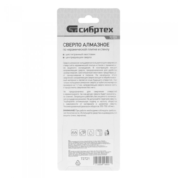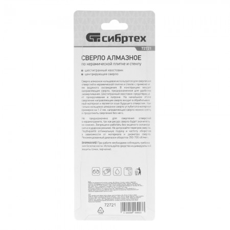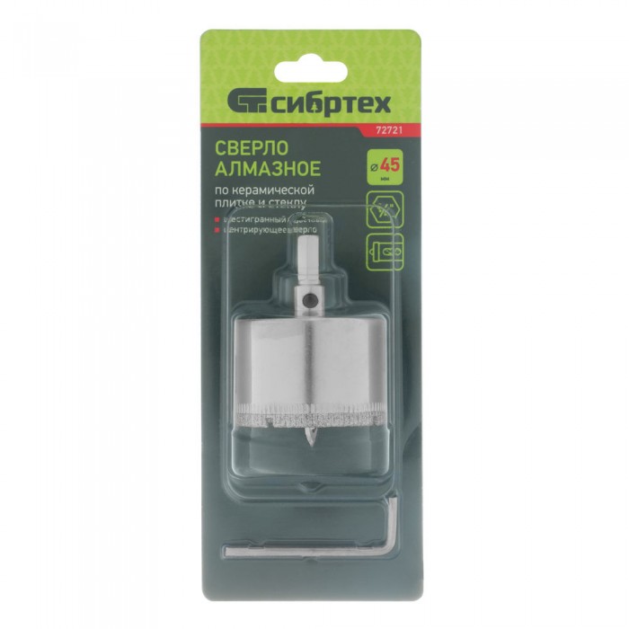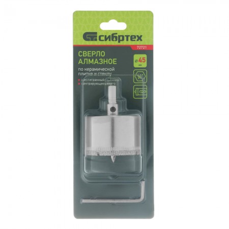 Сверло по керамической плитке и стеклу, 45 х 55 мм, шестигранный хвостовик, с центрующим сверлом Сибртех (72721)