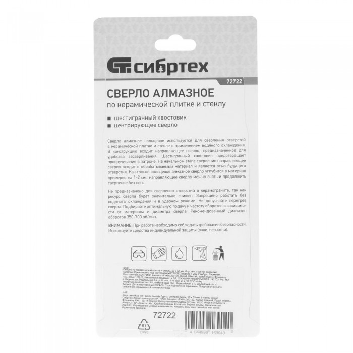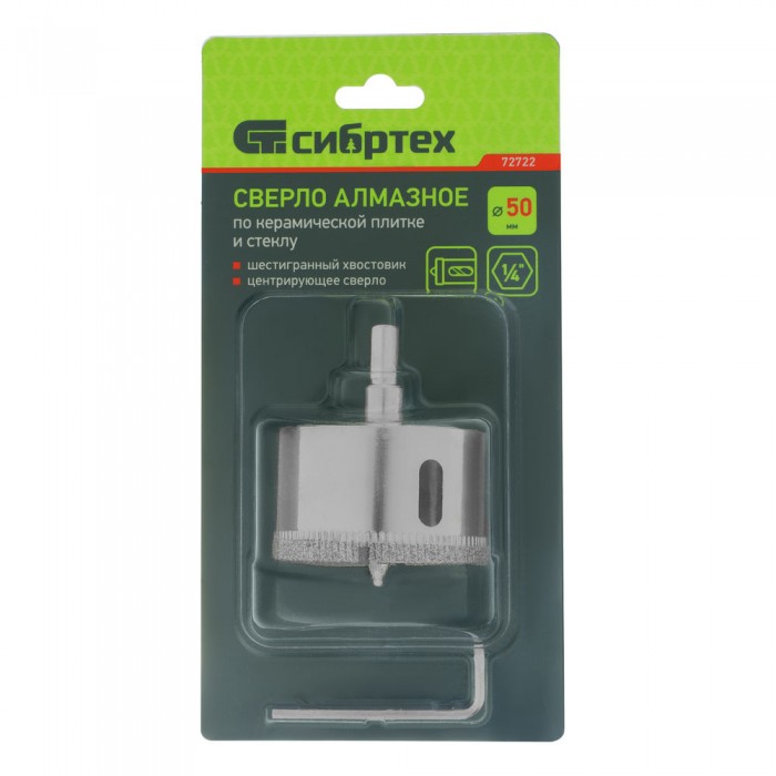 Сверло по керамической плитке и стеклу, 50 х 55 мм, шестигранный хвостовик, с центрующим сверлом Сибртех (72722)