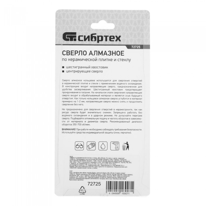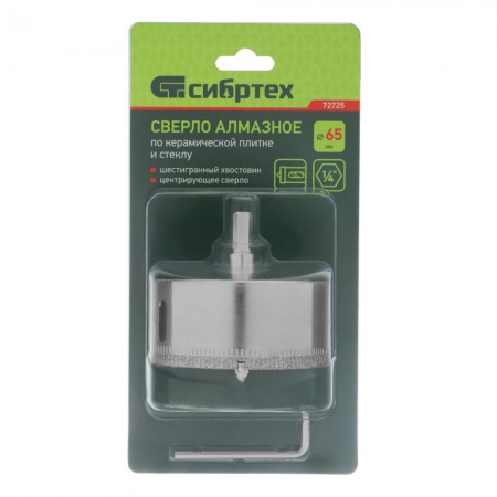Сверло по керамической плитке и стеклу, 65 х 55 мм, шестигранный хвостовик, с центрующим сверлом Сибртех (72725)