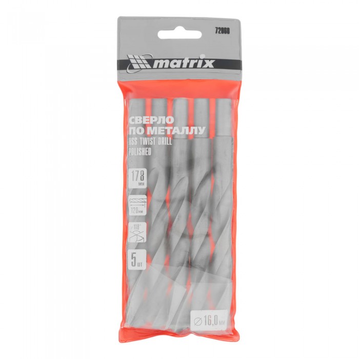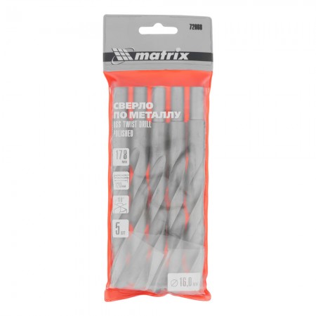 Сверло по металлу, 16 мм, полированное, HSS, 5 шт, цилиндрический хвостовик Matrix