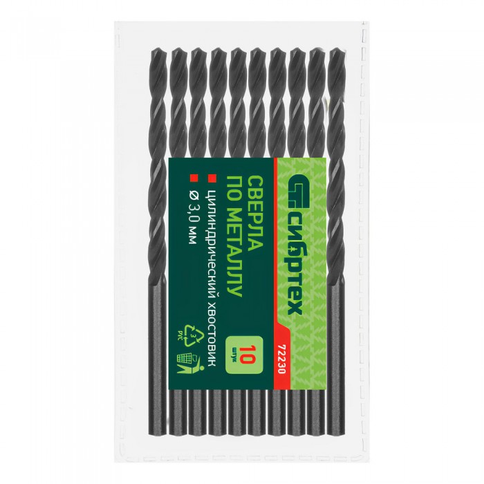 Сверло по металлу, 3 мм, быстрорежущая сталь, 10 шт, цилиндрический хвостовик Сибртех
