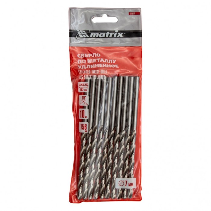 Сверло по металлу, 7 х 156 мм, полированное, удл, HSS, 10 шт, цилиндрический хвостовик Matrix