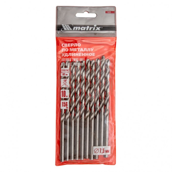 Сверло по металлу, 7.5 х 156 мм, полированное, удл, HSS, 10 шт, цилиндрический хвостовик Matrix
