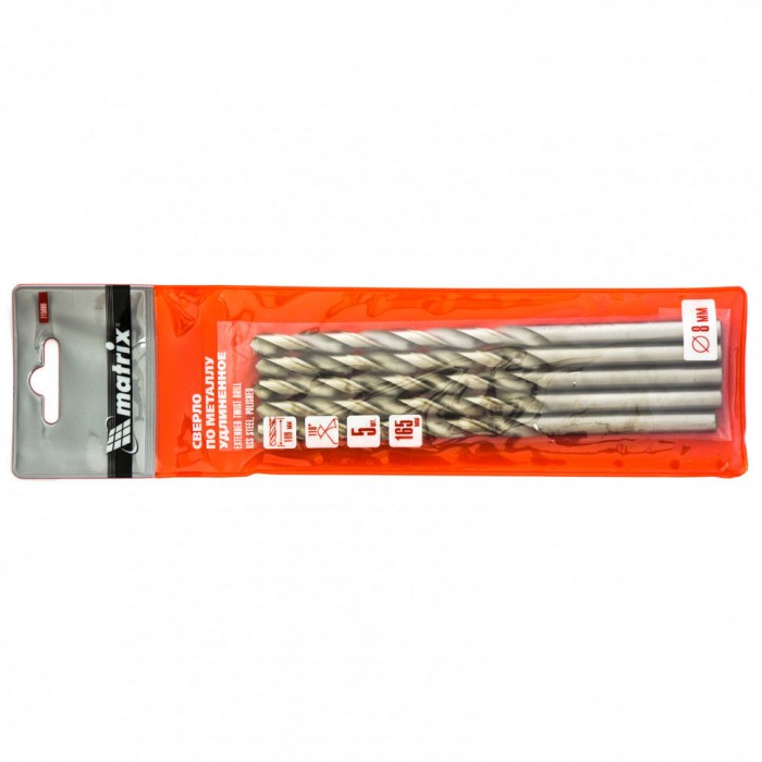 Сверло по металлу, 8 х 165 мм, полированное, удл, HSS, 5 шт, цилиндрический хвостовик Matrix