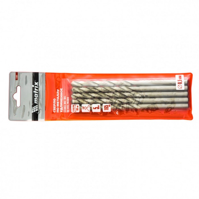 Сверло по металлу, 8.5 х 165 мм, полированное, удл, HSS, 5 шт, цилиндрический хвостовик Matrix