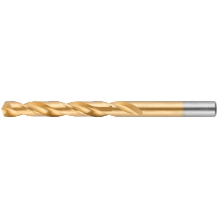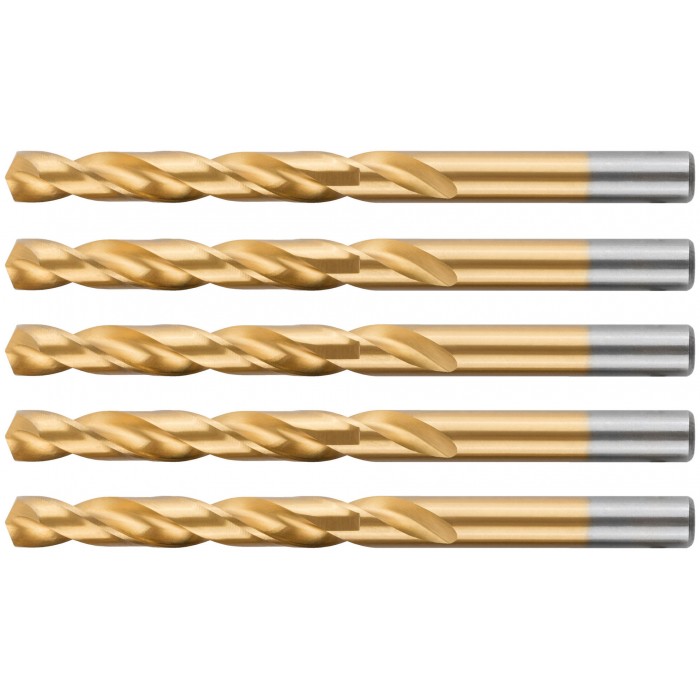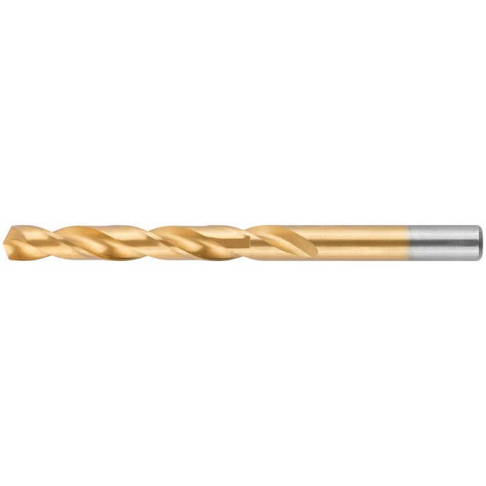 Нанесение нитрид титана(TiN) укрепляет лезвие сверла, делая срок службы сверла значительно больше. Изготовлено методом вышлифовки профиля из высококачественной стали типа HSS с твердостью 64-64 HRC. Это обеспечивает малое значение осевого и радиального биения. Благодаря сплаву с добавлением 6% Вольфрама и 5% Молибдена сверло способно выдержать высокие температуры, а 4% Хрома и 2% Ванадия в составе предотвращают коррозию сверла, продлевая срок службы изделия. Крестообразный угол заточки 135°, класс точности А1. Предназначено для сверлений отверстий в углеродистых и легированных сталях, серых и ковких чугунах, цветных металлах и пластике.