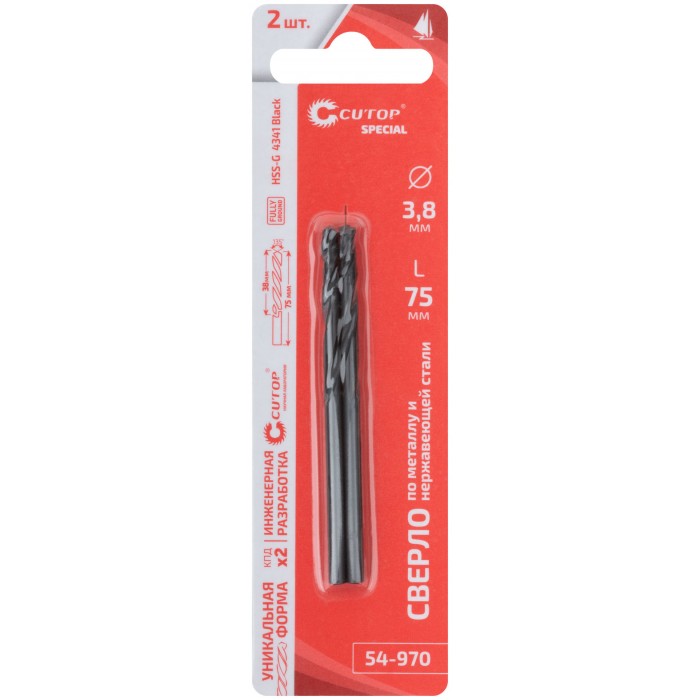 Сверло по металлу Cutop Special, HSS-G, 3,8 х 75/38 мм (2 шт) (54-970)