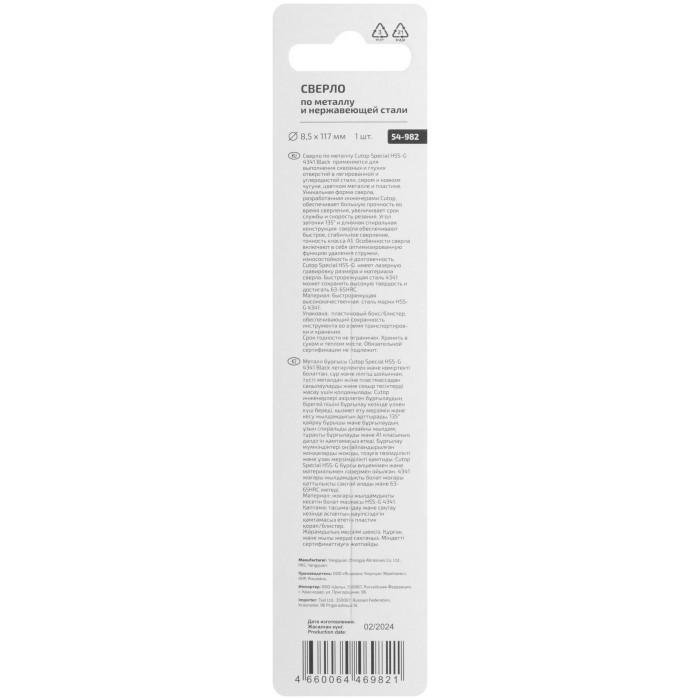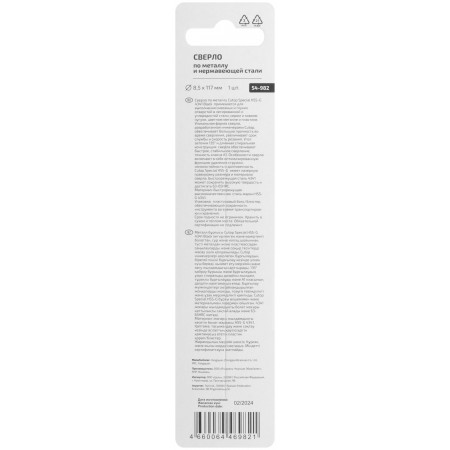 Сверло по металлу Cutop Special, HSS-G, 8,5 х 117/67 мм (1 шт) (54-982)