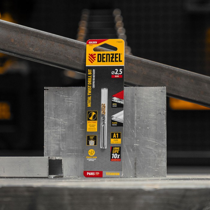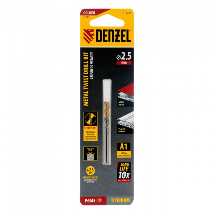 Сверло спиральное по металлу 2,5 x 57 мм, Р6М5, Golden Tip , 2шт. Denzel (718224)